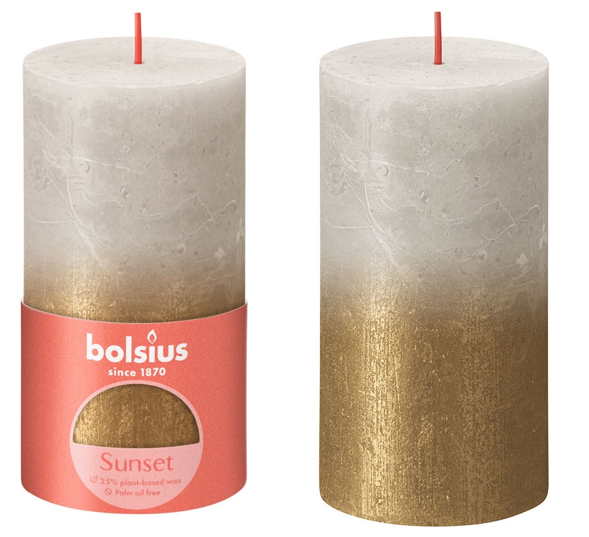 L647121 – Vela pilar “sunset” Cinza/Ouro 130, pilar, com as dimensões: altura 13.0 cm, diâmetro 6.8 cm, duração da vela 60h. Produto com 25% de cera de flores e 0% óleo de palma. Artigo de fabrico holandês, da marca Bolsius. Este artigo é vendido à unidade. É inegavelmente um artigo indispensável para a decoração de mesas de natal, festas cujo tema é o dourado ou dia dos namorados.