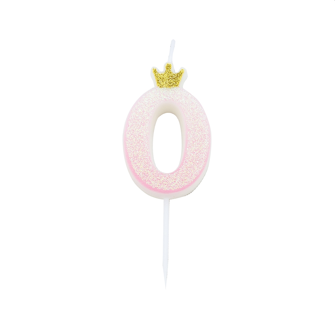 B506.80 – Vela Rosa Coroa número 0, Rosa desvanecido com glitter, com suporte de espeto plástico, 9.5 cm. Artigo de fabrico Itália/RPC. Artigo essencial no bolo de aniversário. Juntamente com outros artigos na loja, tais como: copos, pratos, toalhas e muitos outros. Também pode ser utilizado em festas temáticas, como por exemplo: minnie, princesas, frozen, entre outras.