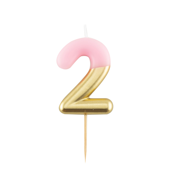 B506.62 – Vela Rosa e Dourada número 2, com suporte de espeto madeira, 8 cm. Artigo de fabrico Itália/RPC. Artigo essencial no bolo de aniversário. Juntamente com outros artigos na loja, tais como: copos, pratos, toalhas e muitos outros. Também pode ser utilizado em festas temáticas, como por exemplo: minnie, princesas, frozen, entre outras.