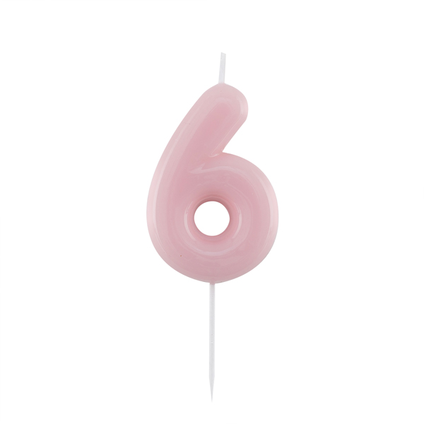 B503.86 – Vela Rosa Glossy número 6, com suporte de espeto branco, 10.5 cm. Artigo de fabrico RPC da marca GIVITALIA . Artigo essencial no bolo de aniversário. Juntamente com outros artigos na loja, tais como: copos, pratos, toalhas e muitos outros. Também pode ser utilizado em festas temáticas, como por exemplo: minnie, princesas, frozen, entre outras.