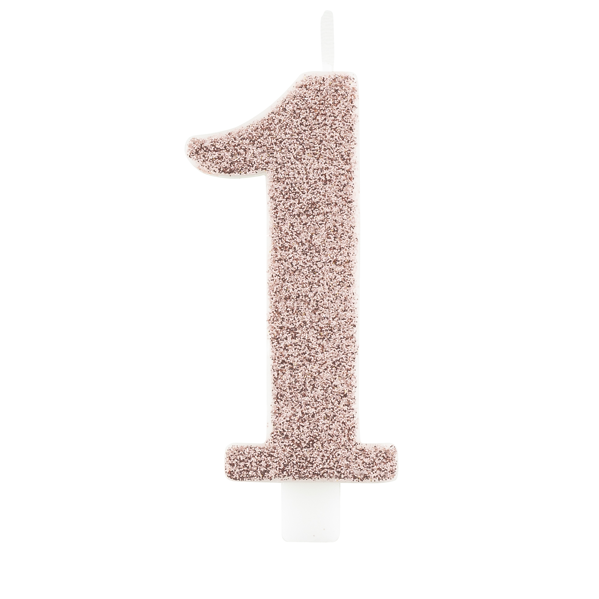 B507.61 – Vela Rose Gold glitter número 1, com suporte de espeto plástico transparente, 9.5 cm. Artigo de fabrico RPC. Artigo essencial no bolo de aniversário. Juntamente com outros artigos na loja, tais como: copos, pratos, guardanapos, toalhas e muitos outros. Também pode ser utilizado em festas temáticas, como por exemplo: princesas, minnie, lol, frozen, entre muitas outras.