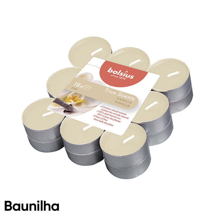 L43475 – Vela tealight aroma Baunilha 18, diâmetro 4cm, duração aproximada 4h, pack 18 un. Artigo de fabrico holandês, da marca Bolsius. Este artigo é vendido aos packs de 18un. É inegavelmente um artigo indispensável para a decoração de mesas de natal, festas cujo tema é o dourado ou Dia dos Namorados.