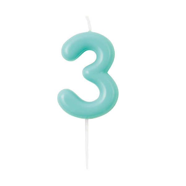 B500.63 – Vela Verde Água Glossy número 3, com suporte de espeto branco, 10.5 cm. Artigo de fabrico RPC da marca GIVITALIA .Artigo essencial no bolo de aniversário. Juntamente com outros artigos na loja, tais como: copos, pratos, toalhas e muitos outros. Também pode ser utilizado em festas temáticas, como por exemplo: minnie, princesas, frozen, entre outras.