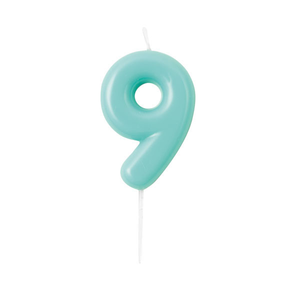B500.69 – Vela Verde Água Glossy número 9, com suporte de espeto branco, 10.5 cm. Artigo de fabrico RPC da marca GIVITALIA .Artigo essencial no bolo de aniversário. Juntamente com outros artigos na loja, tais como: copos, pratos, toalhas e muitos outros. Também pode ser utilizado em festas temáticas, como por exemplo: minnie, princesas, frozen, entre outras.